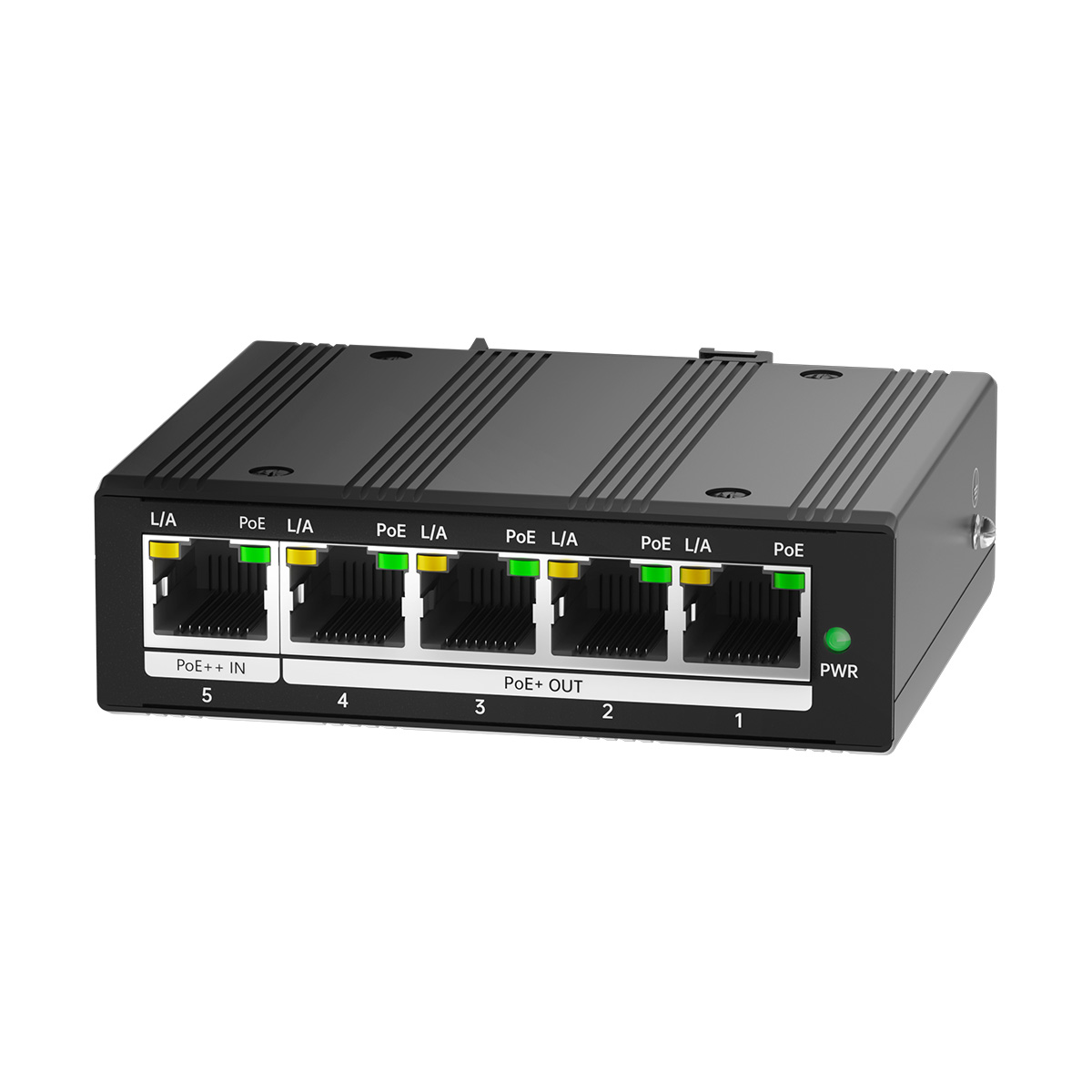 يُعدّ جهاز IES7211-EX04G-90W من مجموعة Benchu محوّلاً صناعياً من خمسة منافذ PoE Passthrough مصمماً لنشر الشبكات في الأماكن التي تُشكّل فيها منافذ الطاقة والمسافة قيوداً. يستقبل الجهاز البيانات وما يصل إلى 90 واط من الطاقة عبر كابل إدخال واحد من نوع 802.3bt PoE++، ثم يوزّع كليهما على أربعة أجهزة متصلة، موفراً 30 واط من طاقة 802.3at PoE+ لكل منفذ لكاميرات IP ونقاط الوصول وأجهزة إنترنت الأشياء.
